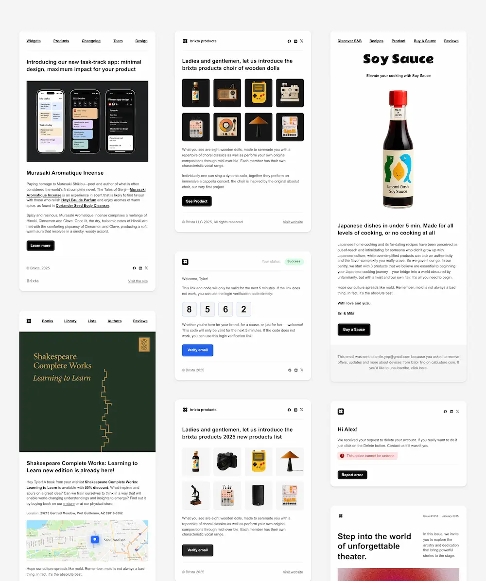 Brixta is a centralized system for managing email templates. Instead of designing and coding each email manually, you write content as simple text and generate templates automatically. This removes the need for separate design and development work.